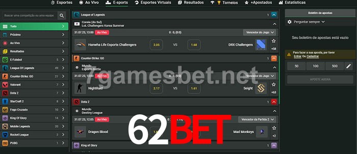 O 62Bet oferece uma grande seleção de opções de apostas em e-sports com probabilidades competitivas